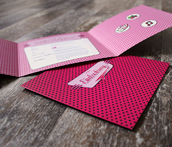 Design von Einladungs- und Getränkekarten für eine Rockabilly-Motto-Party.
